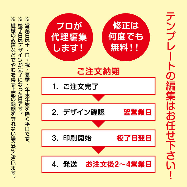 - ご注文完了後に、登録のメールアドレスへデザイン確認データをお送りいたします。デザイン確認データは何度でも変更可能です。デザイン完了後に印刷へ進めさせていただきます。