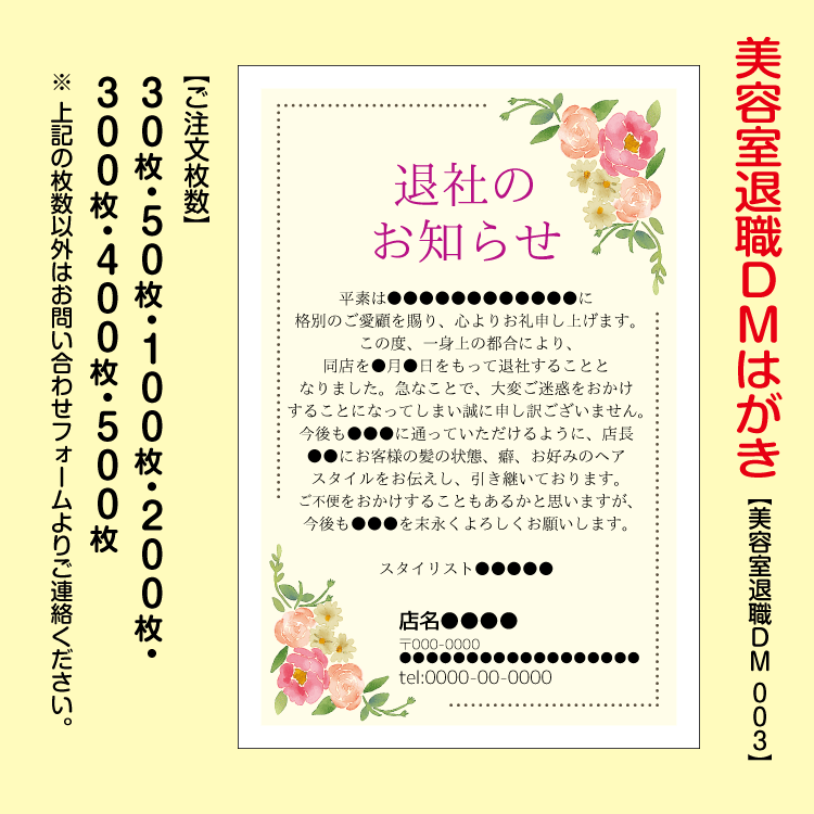 美容師・ネイリスト・エステシャンの方が、結婚や出産、独立や転職を期に現在のサロンを退社する際の退職ハガキ。