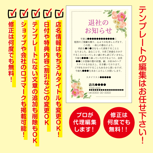 今後ともお店とお客様の長いお付き合いのためにも、お世話になったお客様のためにも退社の案内状や店舗異動の挨拶状は、決定次第できるだけ早くお客様へご案内したいものです。