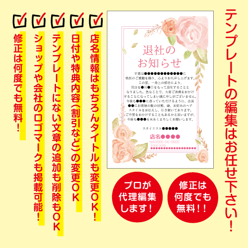 美容師・ネイリスト・エステシャンの方が、結婚や出産、独立や転職を期に現在のサロンを退社する際の退職ハガキ。