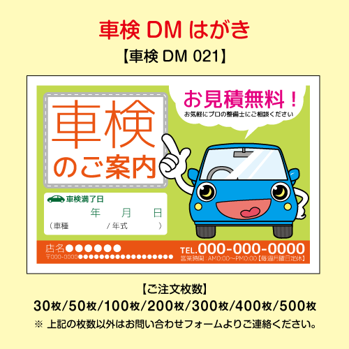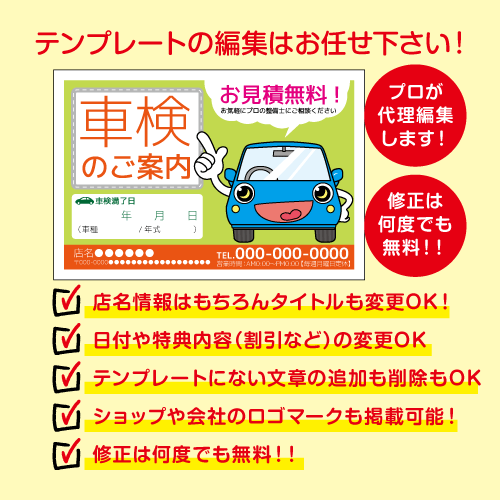 自動車整備工場様向けの車検の案内はがきDM。シンプルでわかりやすいタイトルとイラスト入りの車検案内DMハガキです。デザインテンプレートから、お客様店舗情報や特典、キャッチコピーなどご指示どおりにお作りいたします。高額なデザイン費用は不要!当社デザイナーがお客様に変わり選択したデザインテンプレートを編集させていただきます。