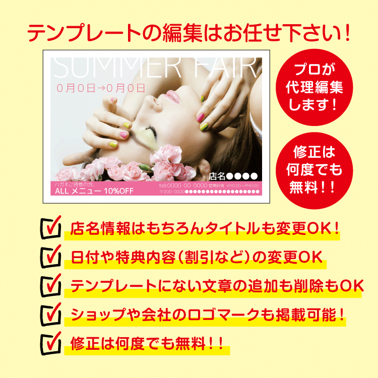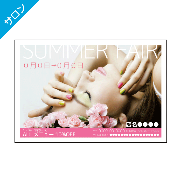サロン様の周年祭や季節のおすすめメニューがお得になるイベントのご案内に最適なDMハガキデザインです。