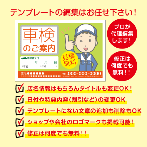 自動車整備工場様向けの車検の案内はがきDM。爽やかや整備士のイラスト入り車検案内DMハガキです。