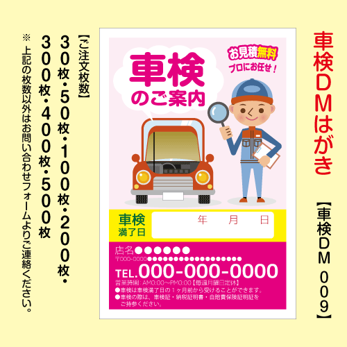 自動車整備工場様向けの車検の案内はがきDM。爽やかや整備士のイラスト入り車検案内DMハガキです。デザインテンプレートから、お客様店舗情報や特典、キャッチコピーなどご指示どおりにお作りいたします。高額なデザイン費用は不要!当社デザイナーがお客様に変わり選択したデザインテンプレートを編集させていただきます。