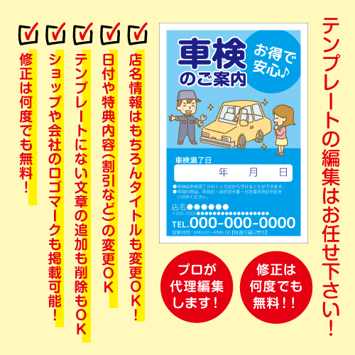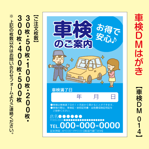 自動車整備工場様向けの車検の案内はがきDM。爽やかや整備士のイラスト入り車検案内DMハガキです。デザインテンプレートから、お客様店舗情報や特典、キャッチコピーなどご指示どおりにお作りいたします。高額なデザイン費用は不要!当社デザイナーがお客様に変わり選択したデザインテンプレートを編集させていただきます。