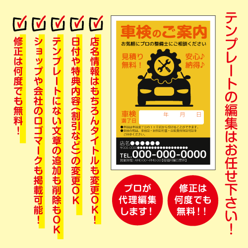 自動車整備工場様向けの車検の案内はがきDM。シンプルでわかりやすいタイトルとイラスト入りの車検案内DMハガキです。デザインテンプレートから、お客様店舗情報や特典、キャッチコピーなどご指示どおりにお作りいたします。高額なデザイン費用は不要!当社デザイナーがお客様に変わり選択したデザインテンプレートを編集させていただきます。