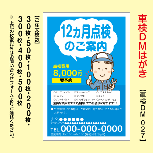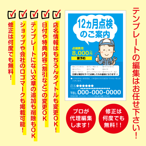 自動車整備工場様向けの12ヶ月点検の案内はがきDM。シンプルでわかりやすいタイトルとイラスト入りの12ヶ月点検案内DMハガキです。デザインテンプレートから、お客様店舗情報や特典、キャッチコピーなどご指示どおりにお作りいたします。高額なデザイン費用は不要!当社デザイナーがお客様に変わり選択したデザインテンプレートを編集させていただきます。