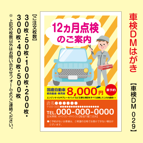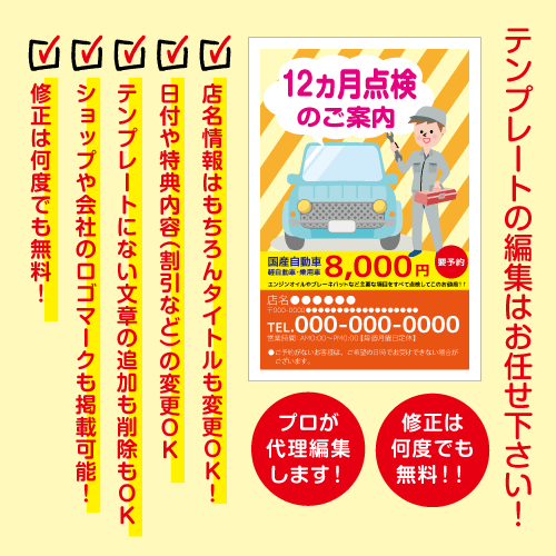 自動車整備工場様向けの12ヶ月点検の案内はがきDM。シンプルでわかりやすいタイトルとイラスト入りの12ヶ月点検案内DMハガキです。デザインテンプレートから、お客様店舗情報や特典、キャッチコピーなどご指示どおりにお作りいたします。高額なデザイン費用は不要!当社デザイナーがお客様に変わり選択したデザインテンプレートを編集させていただきます。