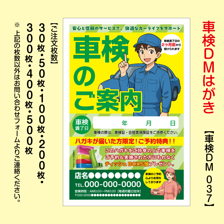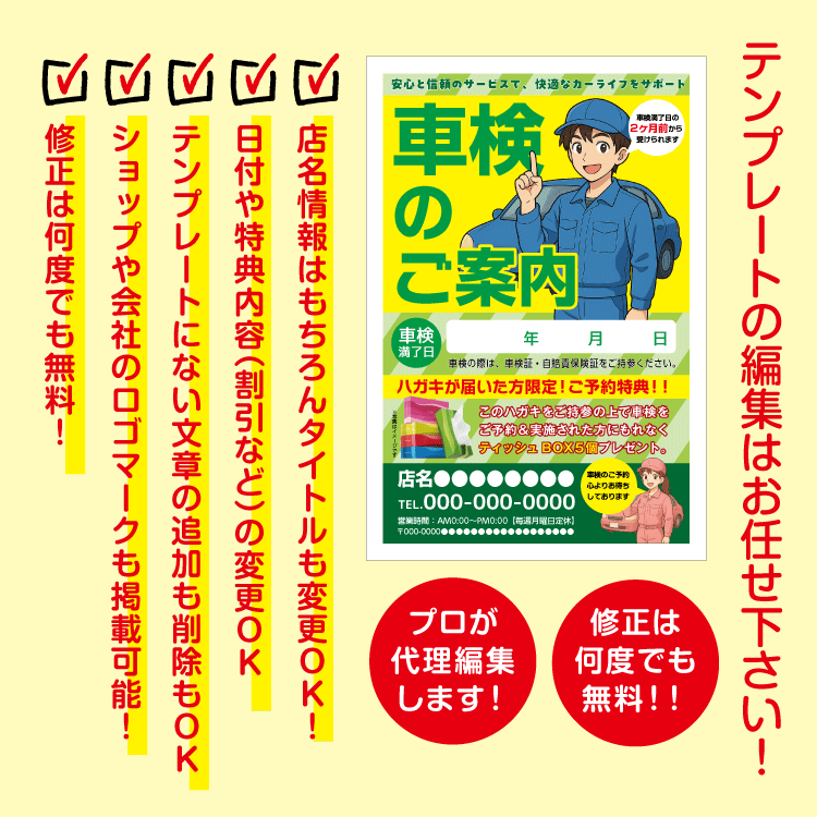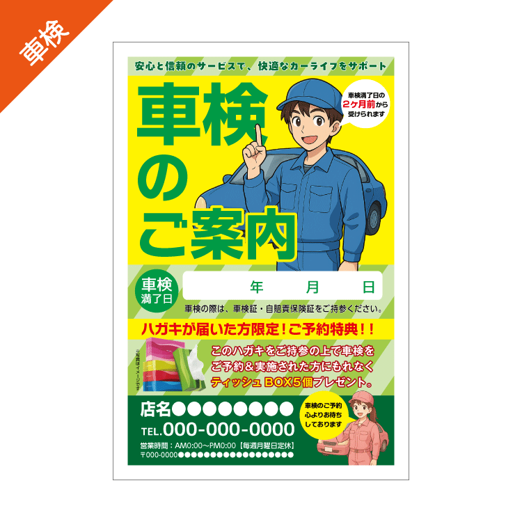 自動車整備工場様、自動車販売店様の車検のご案内はがきDM。シンプルでわかりやすいタイトルとイラスト入りの車検案内DMハガキです。デザインテンプレートから、お客様店舗情報特典や、キャッチコピーなどご指示の方向けにお作り致します。高額なデザイン費用は不要です!当社デザイナーがお客様に変わり選択したデザインテンプレートを編集させていただきます。