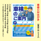 自動車整備工場様、自動車販売店様の車検のご案内はがきDM。シンプルでわかりやすいタイトルとイラスト入りの車検案内DMハガキです。デザインテンプレートから、お客様店舗情報特典や、キャッチコピーなどご指示の方向けにお作り致します。高額なデザイン費用は不要です!当社デザイナーがお客様に変わり選択したデザインテンプレートを編集させていただきます。