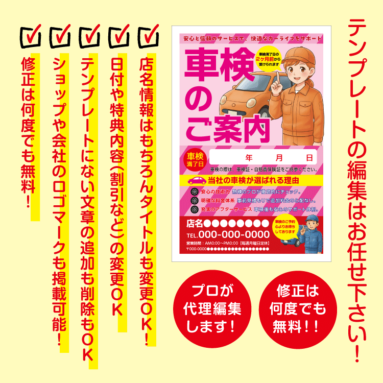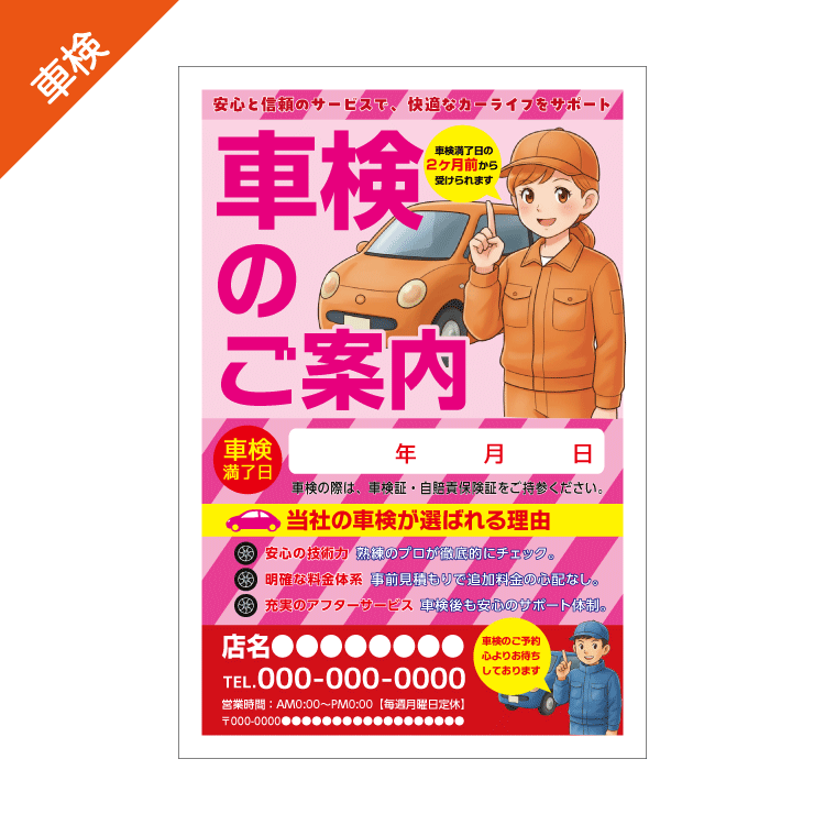 自動車整備工場様、自動車販売店様の車検のご案内はがきDM。シンプルでわかりやすいタイトルとイラスト入りの車検案内DMハガキです。デザインテンプレートから、お客様店舗情報特典や、キャッチコピーなどご指示の方向けにお作り致します。高額なデザイン費用は不要です!当社デザイナーがお客様に変わり選択したデザインテンプレートを編集させていただきます。