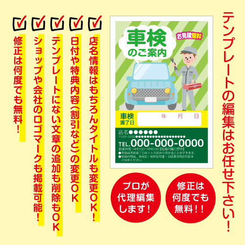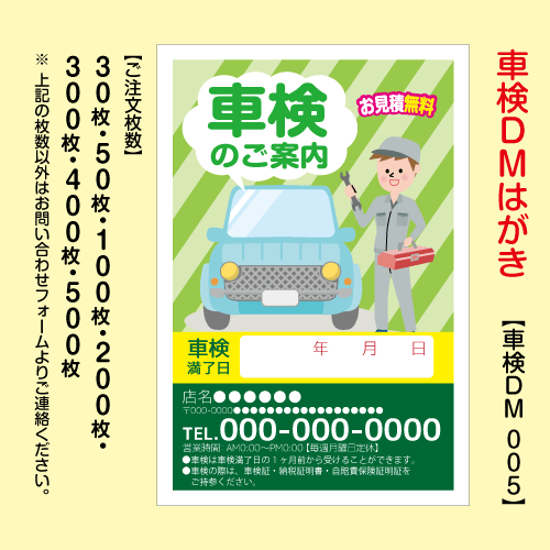 自動車整備工場様向けの車検の案内はがきDM。爽やかや整備士のイラスト入り車検案内DMハガキです。デザインテンプレートから、お客様店舗情報や特典、キャッチコピーなどご指示どおりにお作りいたします。高額なデザイン費用は不要!当社デザイナーがお客様に変わり選択したデザインテンプレートを編集させていただきます。
