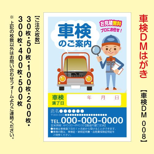 自動車整備工場様向けの車検の案内はがきDM。爽やかや整備士のイラスト入り車検案内DMハガキです。デザインテンプレートから、お客様店舗情報や特典、キャッチコピーなどご指示どおりにお作りいたします。高額なデザイン費用は不要!当社デザイナーがお客様に変わり選択したデザインテンプレートを編集させていただきます。