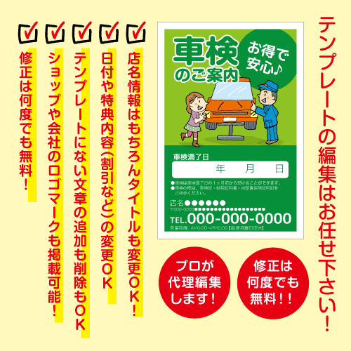 自動車整備工場様向けの車検の案内はがきDM。爽やかや整備士のイラスト入り車検案内DMハガキです。デザインテンプレートから、お客様店舗情報や特典、キャッチコピーなどご指示どおりにお作りいたします。高額なデザイン費用は不要!当社デザイナーがお客様に変わり選択したデザインテンプレートを編集させていただきます。
