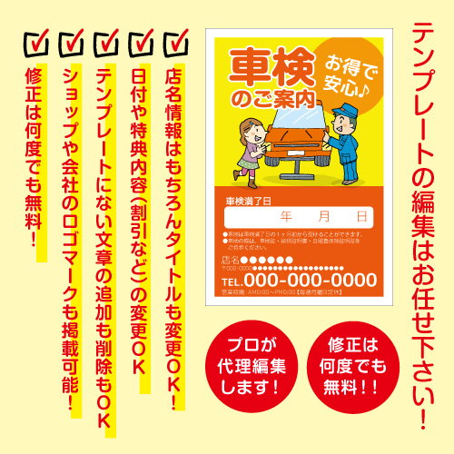 自動車整備工場様向けの車検の案内はがきDM。爽やかや整備士のイラスト入り車検案内DMハガキです。デザインテンプレートから、お客様店舗情報や特典、キャッチコピーなどご指示どおりにお作りいたします。高額なデザイン費用は不要!当社デザイナーがお客様に変わり選択したデザインテンプレートを編集させていただきます。