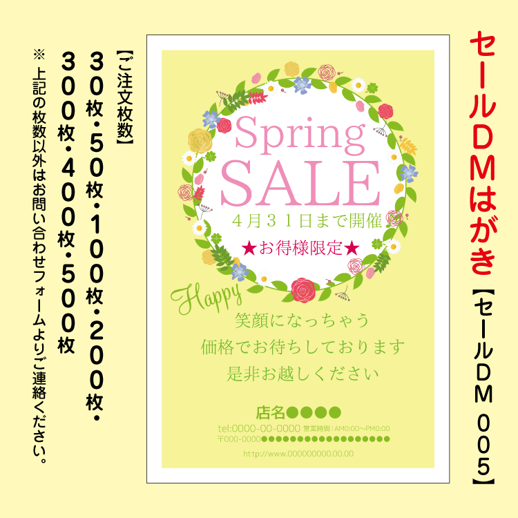 決算セールや周年祭、クリアランスセールなどどんな内容にも使いやすいセールDM。デザインテンプレートから、お客様店舗情報や特典、キャッチコピーなどご指示どおりにお作りいたします。高額なデザイン費用は不要!当社デザイナーがお客様に変わり選択したデザインテンプレートを編集させていただきます。