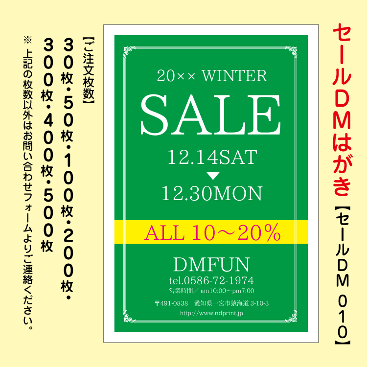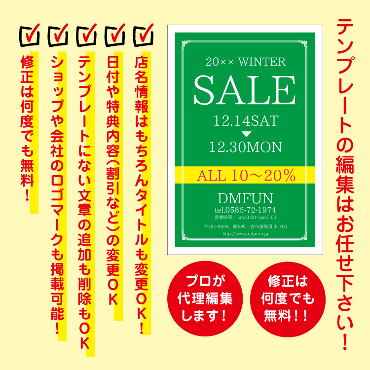 決算セールや周年祭、クリアランスセールなどどんな内容にも使いやすいセールDM。デザインテンプレートから、お客様店舗情報や特典、キャッチコピーなどご指示どおりにお作りいたします。高額なデザイン費用は不要!当社デザイナーがお客様に変わり選択したデザインテンプレートを編集させていただきます。