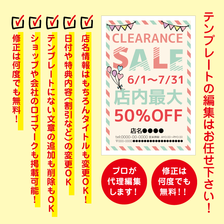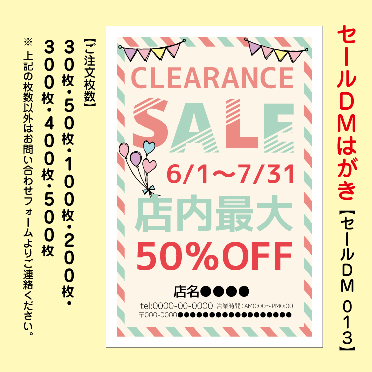 決算セールや周年祭、クリアランスセールなどどんな内容にも使いやすいセールDM。デザインテンプレートから、お客様店舗情報や特典、キャッチコピーなどご指示どおりにお作りいたします。高額なデザイン費用は不要!当社デザイナーがお客様に変わり選択したデザインテンプレートを編集させていただきます。