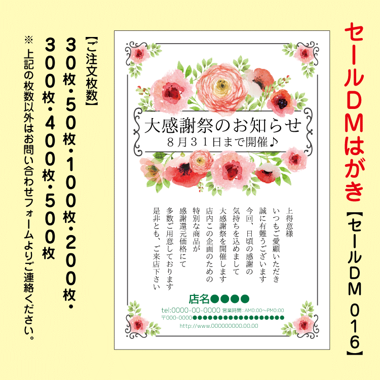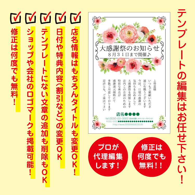 周年祭や感謝祭など感謝の想いをしっかり伝えるセールDM。デザインテンプレートから、お客様店舗情報や特典、キャッチコピーなどご指示どおりにお作りいたします。高額なデザイン費用は不要!当社デザイナーがお客様に変わり選択したデザインテンプレートを編集させていただきます。