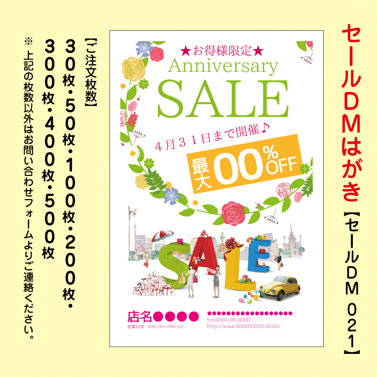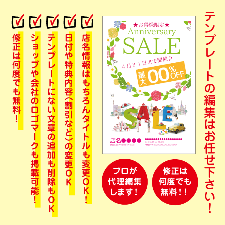 決算セールや周年祭、クリアランスセールなどどんな内容にも使いやすいセールDM。デザインテンプレートから、お客様店舗情報や特典、キャッチコピーなどご指示どおりにお作りいたします。高額なデザイン費用は不要!当社デザイナーがお客様に変わり選択したデザインテンプレートを編集させていただきます。