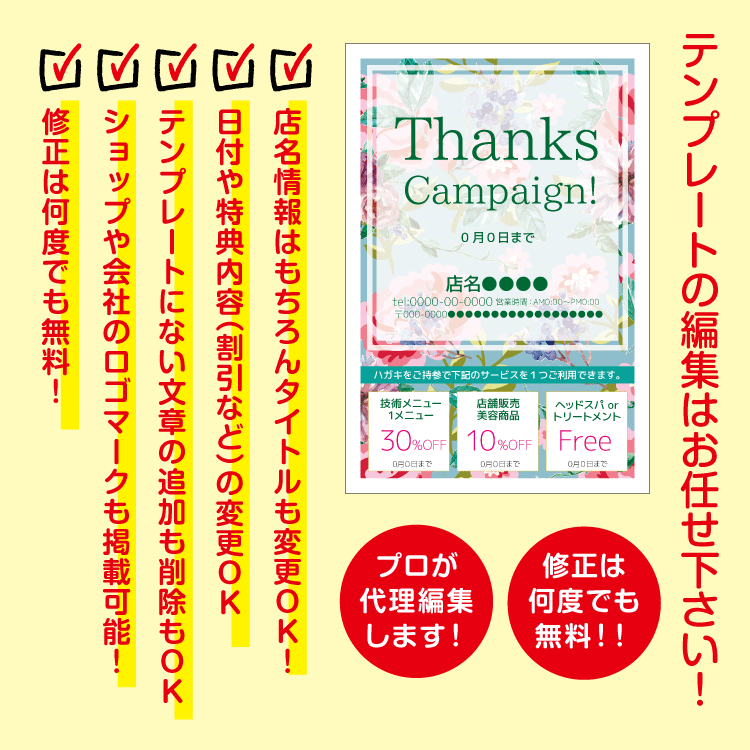 デザインテンプレートから、お客様店舗情報や特典、キャッチコピーなどご指示どおりにお作りいたします。