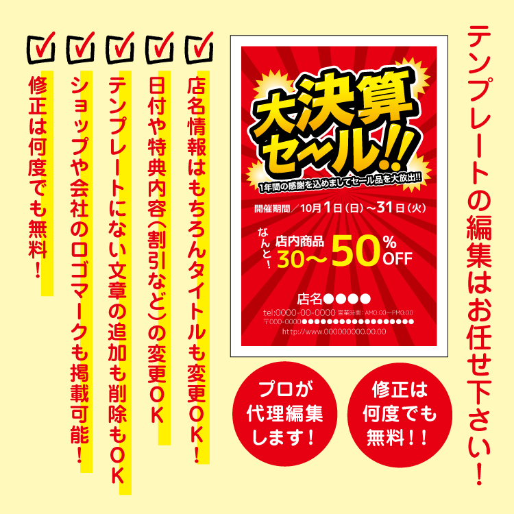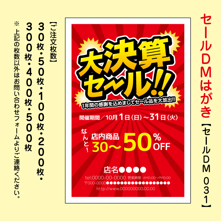決算セールでお得感満載のインパクトあるタイトルなセールDM。デザインテンプレートから、お客様店舗情報や特典、キャッチコピーなどご指示どおりにお作りいたします。高額なデザイン費用は不要!当社デザイナーがお客様に変わり選択したデザインテンプレートを編集させていただきます。