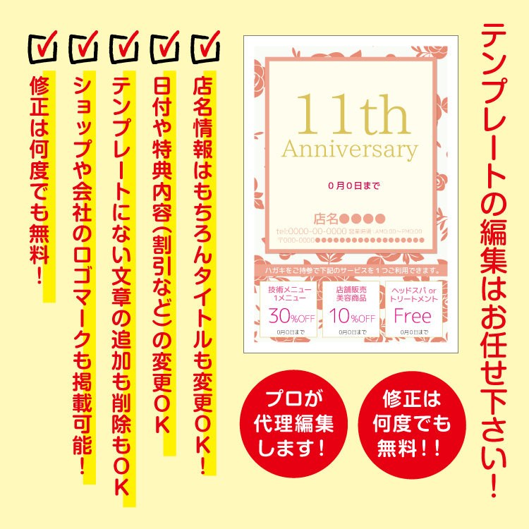 デザインテンプレートから、お客様店舗情報や特典、キャッチコピーなどご指示どおりにお作りいたします。
